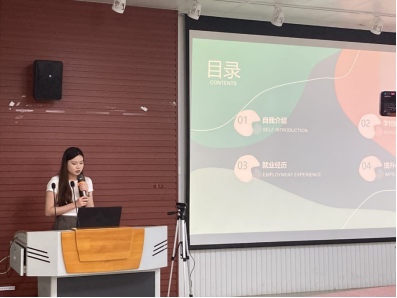 研究生会主席、兼职辅导员,曾获广西大学学业奖学金一等奖、陶建明奖学金等,已被广西电网有限责任公司信息中心录用。莫晓盈同学为大家介绍了研究生一、二、三年级每个阶段应该要完成的事情,并详细介绍了如何备考实习、如何选择应聘单位、如何准备简历。