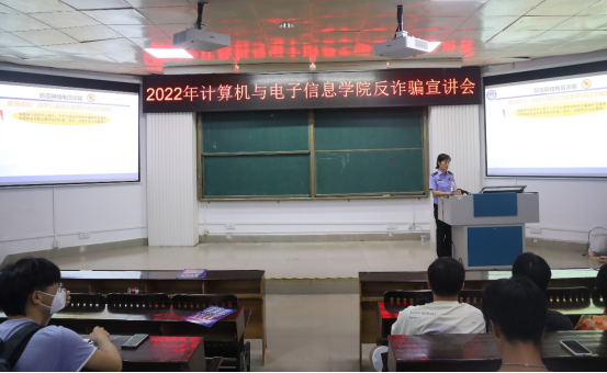 组织举行反诈骗宣讲会。学院辅导员庞承业老师、南宁市公安局西乡塘分局反诈中心杨俭警官以及学院2022级全体新生参加会议。