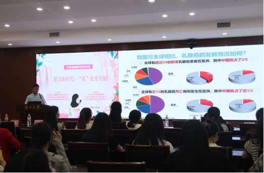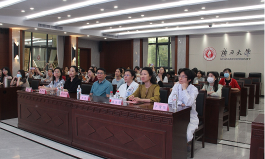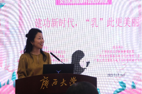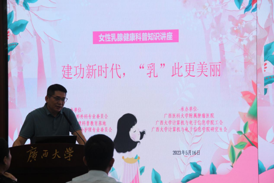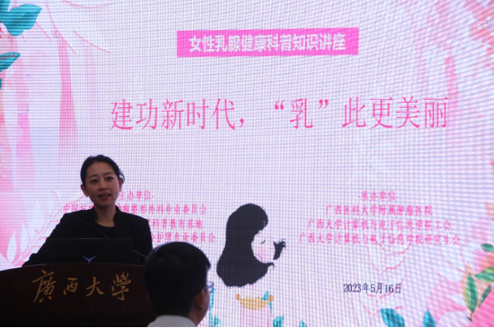 工会发展历史分别做了介绍,也对本次公益活动的专家团队表示感谢。她强调,为提高师生对乳腺疾病的认知,此次活动特别邀请了广西医科大学附属肿瘤医院的乳腺外科专家团队进行宣讲,旨在增强师生的自我保健意识和正确的生活习惯,以健康的体魄融入到学习、工作和生活中。