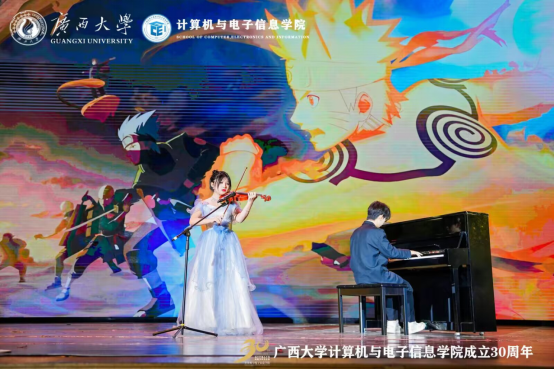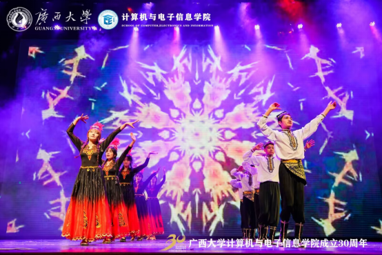 新颖独特的幕布表演《风华正茂,恰少年》,让我们感受到了青春的朝气蓬勃;身姿曼妙,舞步轻快的新疆舞《婆娑西域》让西域之花在南宁绽放;激情澎湃的朗诵和美妙动听的独唱《如愿》让我们感受到祖国的伟大和壮美,也传递出新一代西大计电人“牢记使命,奋发图强,报效国家”的决心。