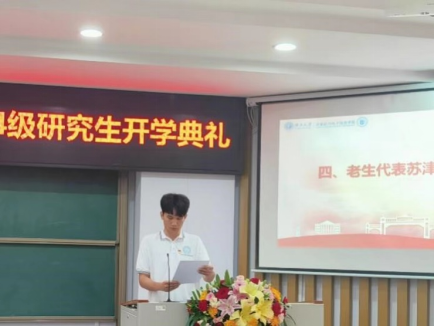 计算机科学与技术241班出君儒同学作为新生代表发言。他强调,作为研究生,面对新的挑战与不确定性,应该秉承初心,砥砺前行,钻研专业知识。他还分享自己过去一年在那坡县民族初级中学支教的经历,表示新时代青年要将自己的命运同国家民族的命运紧紧联系在一起,用自己的实际行动践行责任与担当!