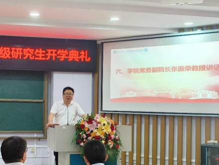 学院常务副院长张振荣教授发表讲话。他首先对新生们表示热烈的欢迎和诚挚的祝贺,希望同学们在研究生阶段培养独立思考和解决问题的能力,面对科研中的挑战要勇敢探索,并肩负起为国家科技进步贡献力量的责任。他给同学们提出三点希望:一要拥抱变化,勇立潮头,勇敢面对信息技术领域的不断革新,积极探索和创新;二要全面发展,身心健康,勉励同学们合理安排时间,练就健康的体魄、坚韧的品质和开朗的性格,实现德智体美劳的全面发展;三要关注社会,承担责任,不仅要关注个人成长,更要关注社会的需求和问题,为社会和国家的发展贡献力量。