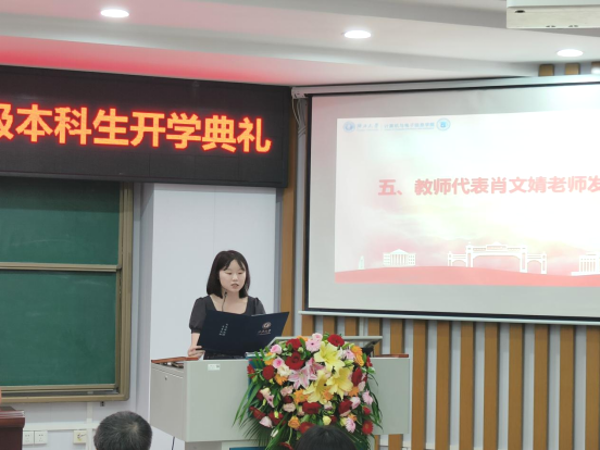 接着,教师代表、计算机科学与技术242班班主任肖文婧老师对各位新同学的到来表示热烈的欢迎。她深情地回顾自己在校期间的求学之旅,鼓励同学们勇敢迎接生活的挑战,勤于思考,真正认识和重塑自我,学会管理好自己,寻找适合的学习目标和研究方向,并将它发展为长久的事业。