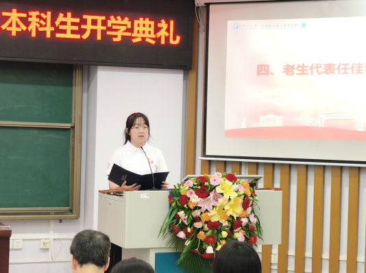 信息安全专业2021级本科生任佳蓉同学作为老生代表发言。她结合自身经历,向全体新生分享三年来的成长与收获,介绍了自己在专业课学习上的经验,勉励同学们在接下来的四年大学生活中,牢记“勤恳朴诚,厚学致新”的校训,以奋发向上的朝气,努力拼搏,勇于探索,创造属于自己的未来,成为一名优秀的计电学子。