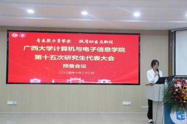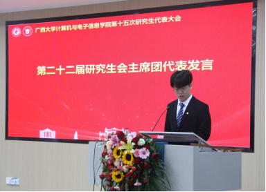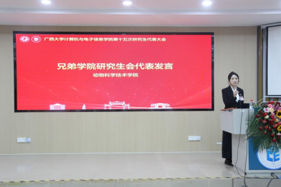 广西大学研究生会代表覃湘怡同学致辞。她对过去一年计算机与电子信息学院研究生会开展的工作表示肯定,并希望学院新一届研究生会与校研究生会继续保持密切沟通与联系,继续在服务同学、推动学术创新和提升校园文化活力方面共同努力。