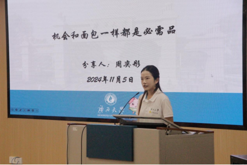 周奕彤同学此次分享的主题是“机会和面包一样都是必需品”。活动伊始,周奕彤同学不仅分享了她从本科至今所完成的丰富多彩的学生工作,还展示了自己在国内外参加的各种社会实践和交流活动的经历。从支教育人到学生工作,从潜心研究到深入实践,她通过这些多元经历,向同学们传达了一个重要的信息:积极参与学生工作与课外实践,不仅能拓宽视野,还能锻炼个人能力。周奕彤同学用自己的实际行动鼓励大家,希望大家能够抓住机会、勇于挑战、提升自我,为未来的发展打下坚实的基础。