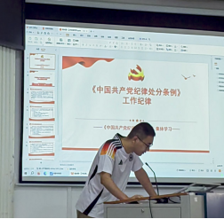 会议第二部分为集体学习《中国共产党纪律处分条例》,由杨志强、唐世铭、阎瑶琳、农甘饶、戴高菁、熊博涵等六位同志分别领学政治纪律、组织纪律、廉洁纪律、群众纪律、工作纪律和生活纪律六个部分。六位同志条理清晰地讲解了各项纪律的含义,列举了具体的违纪行为与相应的处分措施,对比学习了修订内容。
