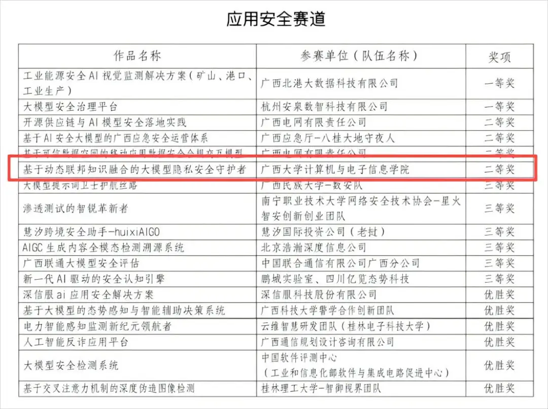 代表队凭借"基于动态联邦知识融合的大模型隐私安全守护者"项目,在应用安全赛道中脱颖而出,荣获二等奖。