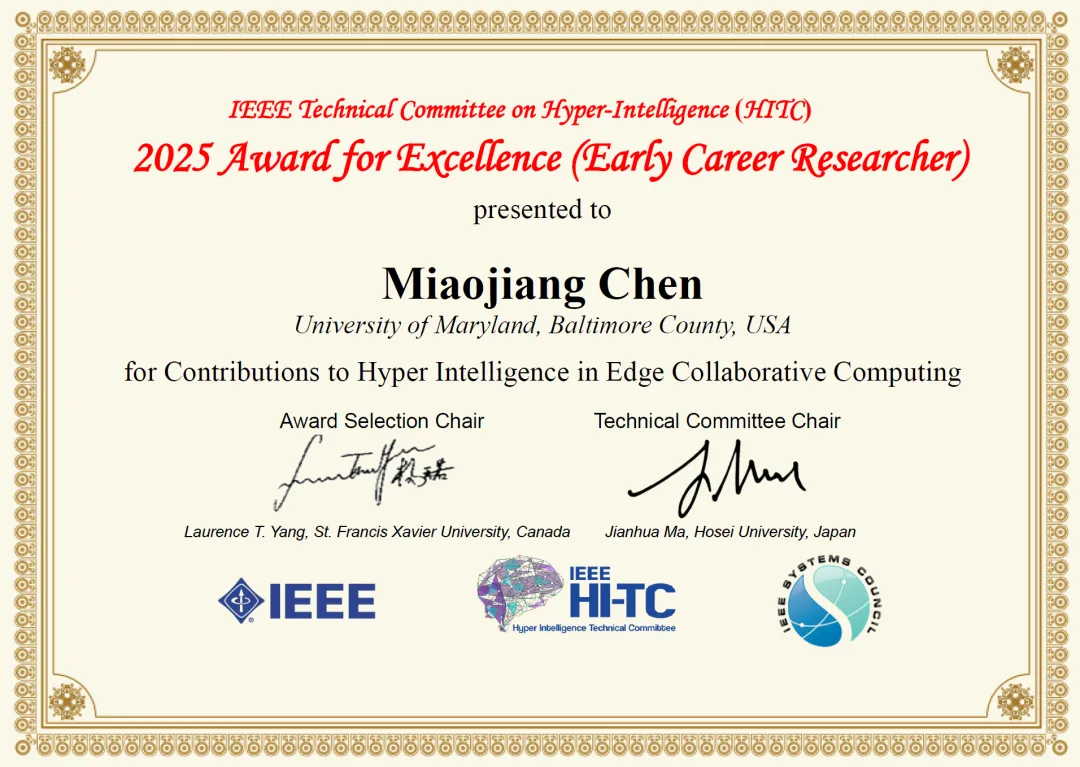 据悉,该奖项由IEEE HITC设立,旨在表彰获博士学位之后五年内在学术上作出贡献、展现出长远发展潜力的优秀青年科学家。2025年度奖项评选竞争激烈,吸引了来自全球范围的众多优秀青年学者候选人。