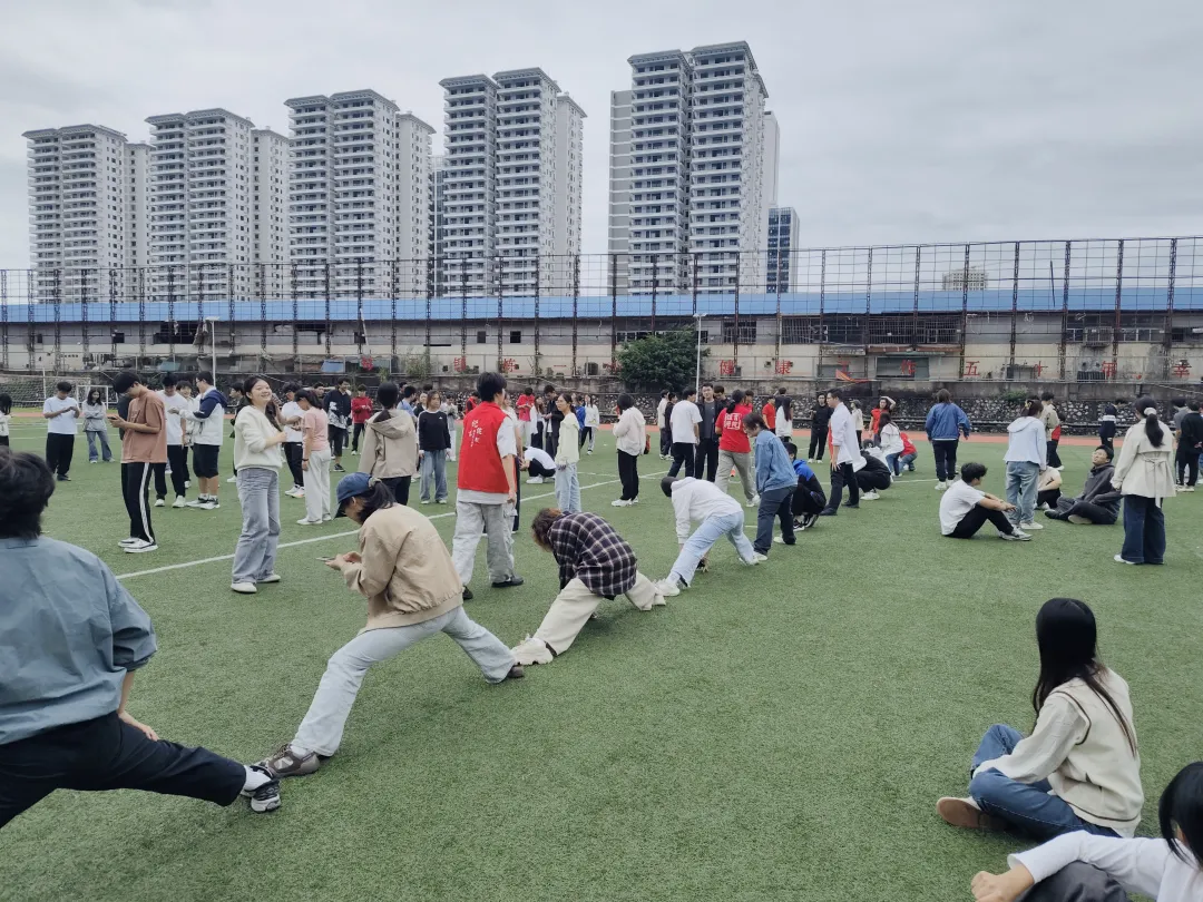 随后,“劈叉接力”、“坐地起身”、“信息中转站”、“爱的魔力转圈圈”等一系列趣味横生的小游戏逐一开展。在劈叉接力中,队员们依次劈叉接龙,脚尖脚跟紧密相连,拉伸与协作并行。一条条“人链”不断延伸,柔韧与团队精神在此刻完美展现,挑战身体极限。在坐地起身中,队员们围坐一圈,臂挽臂、背靠背,一声令下齐心发力。从坐地到一同站起,考验的是默契与配合,每一次成功起身都是团队的胜利。在信息中转站中,两根细绳,十颗网球,队员们小心翼翼接力传递。专注的眼神、稳定的配合,每一次顺利交接都凝聚着团队的智慧与耐心。在爱的魔力转圈圈中,队员们手拉手排成长龙,如旋涡般整齐转动。节奏一致、步伐统一,在旋转中考验协调与默契,场面充满动感与欢笑。
