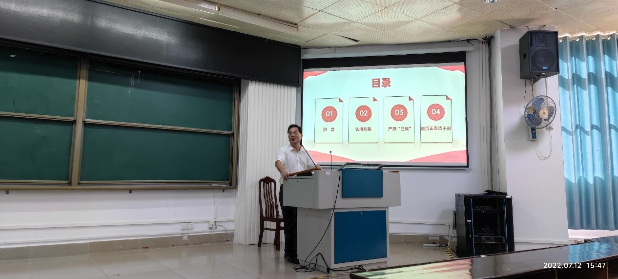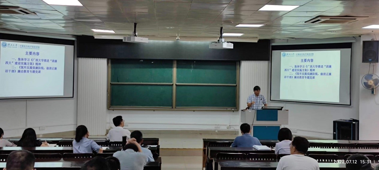 本次大会首先由学院党委副书记、纪委书记邓珍琪同志带领全体教职工共同学习《广西大学推进“清廉西大”建设实施方案》精神;然后邓珍琪同志为全体教职工作题为《筑牢反腐倡廉防线,做清正廉洁干部》廉洁教育专题党课;最后学院党委书记钟诚同志强调要求全体教职工必须高度重视廉洁教育,要将廉洁廉政教育与课程思政有机结合,做到让廉洁文化深入师生心中、廉洁理念成为共识、廉洁自律意识时刻牢记。