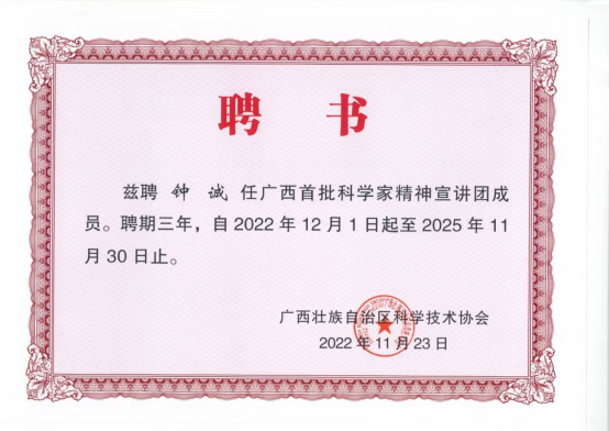 最近,广西壮族自治区科学技术协会颁发聘书,聘任网上赌博网站 钟诚教授为广西首批科学家精神宣讲团成员,聘期三年。广西首批科学家精神宣讲团成员积极参加科学家精神宣讲工作,大力学习宣传贯彻习近平新时代中国特色社会主义思想、党的二十大精神,大力宣传新时代胸怀祖国、服务人民、勇攀高峰、敢为人先、追求真理、严谨治学、淡泊名利、潜心研究、集智攻关、团结协作、甘为人梯、奖掖后学的科学家精神。